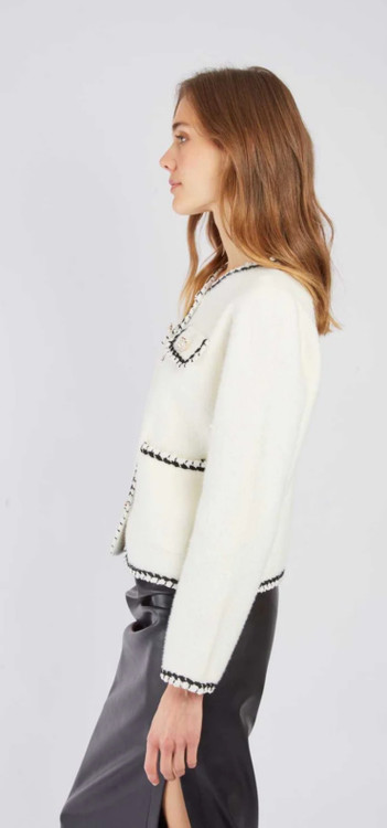 خرید ژاکت بافت زنانه کرم با دوردوزی مشکی – شیک، کلاسیک و مناسب استایل مجلسی