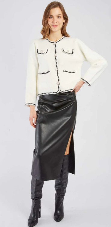 ژاکت بافت زنانه کرم با طراحی شیک و دوردوزی مشکی، مناسب استایل روزمره و مجلسی. کیفیت بالا، بافت گرم و لطیف، قابل ست با دامن و شلوار. خرید با بهترین قیمت.