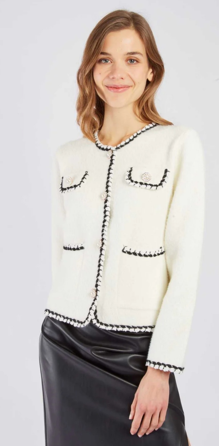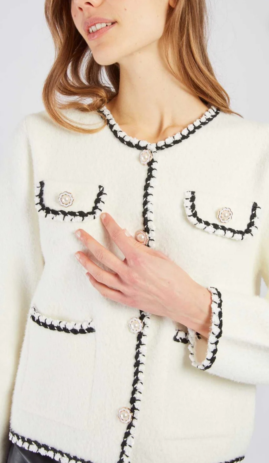 ژاکت بافت زنانه کرم با طراحی شیک و دوردوزی مشکی، مناسب استایل روزمره و مجلسی. کیفیت بالا، بافت گرم و لطیف، قابل ست با دامن و شلوار. خرید با بهترین قیمت.