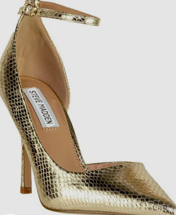 کفش پاشنهبلند طلایی استیو مدن با طرح پوستماری، انتخابی شیک و خاص برای مهمانیها و مراسم رسمی. دارای پاشنه باریک، بند دور مچ، زیره ضدلغزش و کفی راحت. مناسب استایل مجلسی و شب. همین حالا خرید کنید.