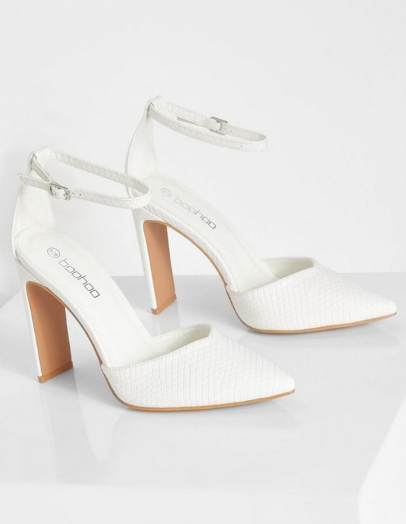 کفش پاشنه بلند زنانه سفید با پاشنه پهن و بند مچی؛ مناسب مهمانی و عروسی. طراحی نوکباریک، رویه طرحدار و بسیار راحت برای استفاده طولانی.