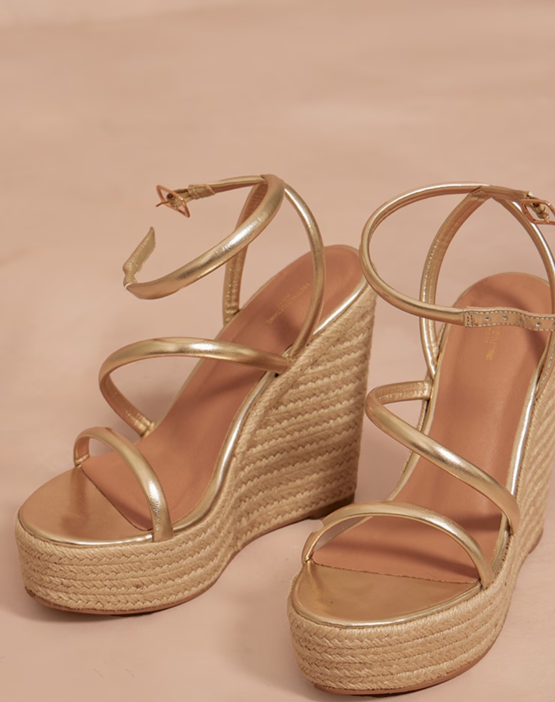 کفش پلتفرمی زنانه طلایی با طراحی بندهای نامتقارن یکی از جذابترین مدلهای امسال است که هم زیبایی و هم راحتی را همزمان ارائه میدهد. این کفش با پاشنه لژدار و قسمت زیره حصیری، فشار را به صورت یکنواخت روی پا توزیع میکند و برای استفاده طولانیمدت در مهمانیها، مراسم و حتی استایل روزمره کاملاً مناسب است.