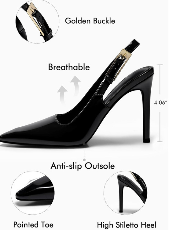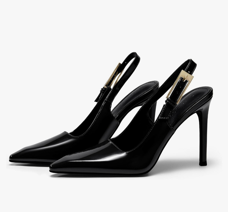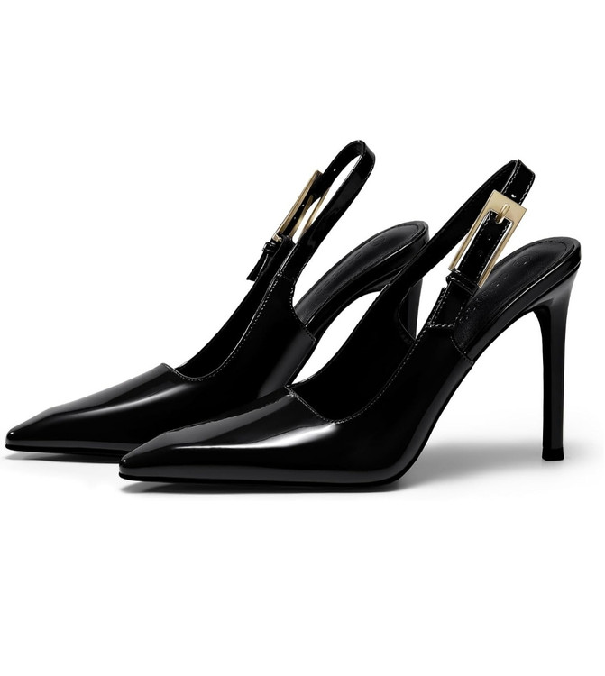 کفش پاشنه بلند زنانه مشکی براق، یکی از شیکترین انتخابها برای استایل مهمانی و مراسم رسمی است. طراحی پشتباز (Slingback) همراه با سگک طلایی قابل تنظیم، علاوه بر زیبایی، راحتی بیشتری هنگام راهرفتن فراهم میکند.