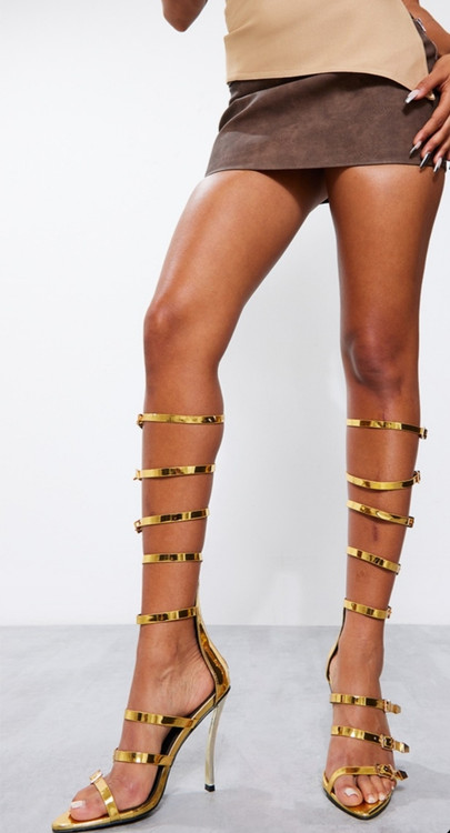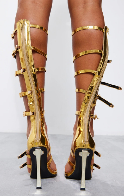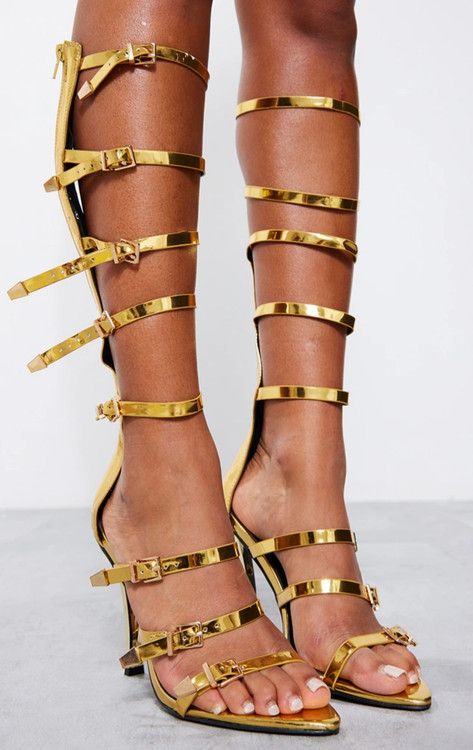 صندل زنانه پاشنه‌بلند طلایی بنددار مدل بند بلند متالیک