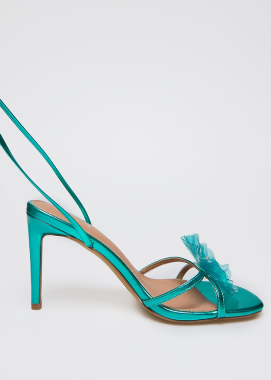 کفش پاشنه بلند زنانه مجلسی مدل گلدار رنگ فیروزهای، بند ظریف و پاشنه ۸ سانتی