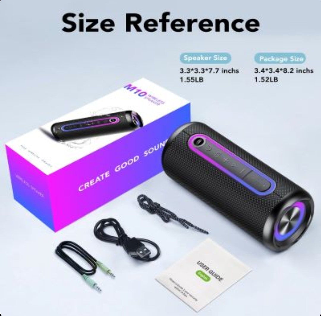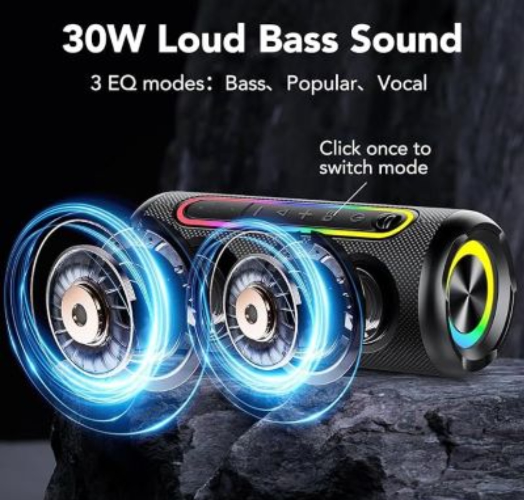 ضد آب و بادوام با استاندارد IPX7: تیم طراحی، جنس بدنه این بلندگوی بلوتوث ضد آب را از بین ۷۸ نوع ماده مقاوم در برابر سایش انتخاب کرده و با فناوری بافت ۹ لایه تقویت شده است، بنابراین حتی در صورت افتادن از ارتفاع ۵ متری نیز آسیبی نمیبیند. قابلیت آببندی عالی آن، رتبه ضد آب IPX7 را به آن میدهد و به بلندگوی بیسیم اجازه میدهد تا به مدت ۳۰ دقیقه تا عمق ۳.۸ فوت در آب غوطهور بماند. این بلندگو برای پیادهروی، کمپینگ، کوهنوردی و دوچرخهسواری عالی است. عمر باتری 30 ساعته و صدای استریو TWS: این بلندگوی بلوتوث قابل حمل به یک باتری لیتیومی قابل شارژ 4000 میلیآمپر ساعتی مجهز شده است که تنها با 3 ساعت شارژ، تا 30 ساعت پخش موسیقی را فراهم میکند. علاوه بر این، میتوانید چراغهای RGB را خاموش کنید تا عمر باتری بلندگو افزایش یابد. این بلندگوی بلوتوث بیسیم دارای فناوری اتصال TWS است که به شما امکان میدهد دو بلندگوی قابل حمل را برای تجربه شنیداری شبیه به صدای فراگیر دالبی متصل کنید، گویی در یک سینمای خصوصی هستید.