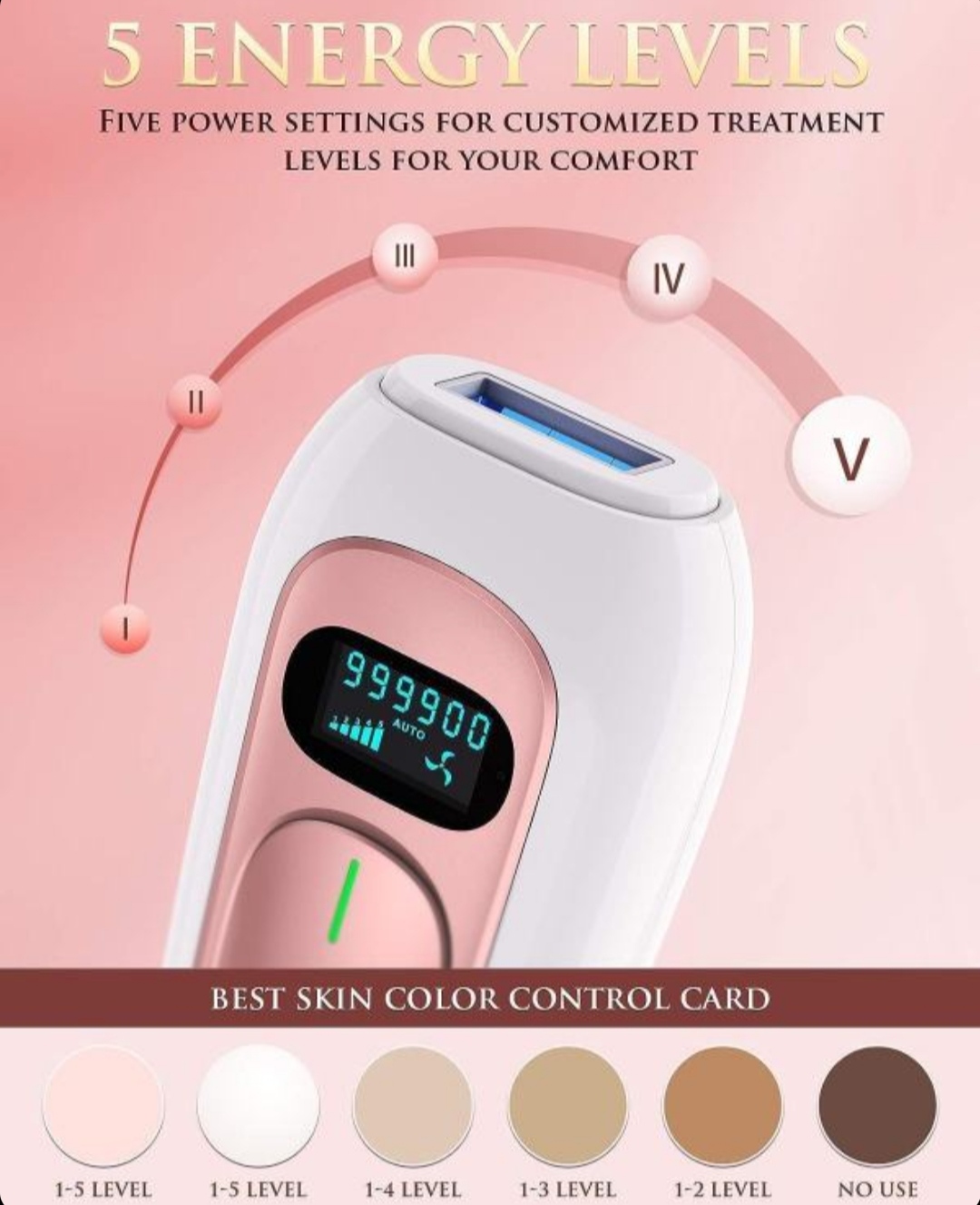 5 سطح انرژی: این دستگاه رفع موهای زائد AMINZER IPL دارای 5 سطح انرژی قابل تنظیم است که برای حساسیتهای مختلف پوستی و نواحی تحت درمان مناسب است. طراحی 2 دکمهای، استفاده آسان و سطح و حالت قدرت قابل تنظیم. و مجهز به یک صفحه نمایش LCD بزرگ، میتوانید تنظیمات عملیاتی مورد استفاده را به وضوح کنترل کنید.