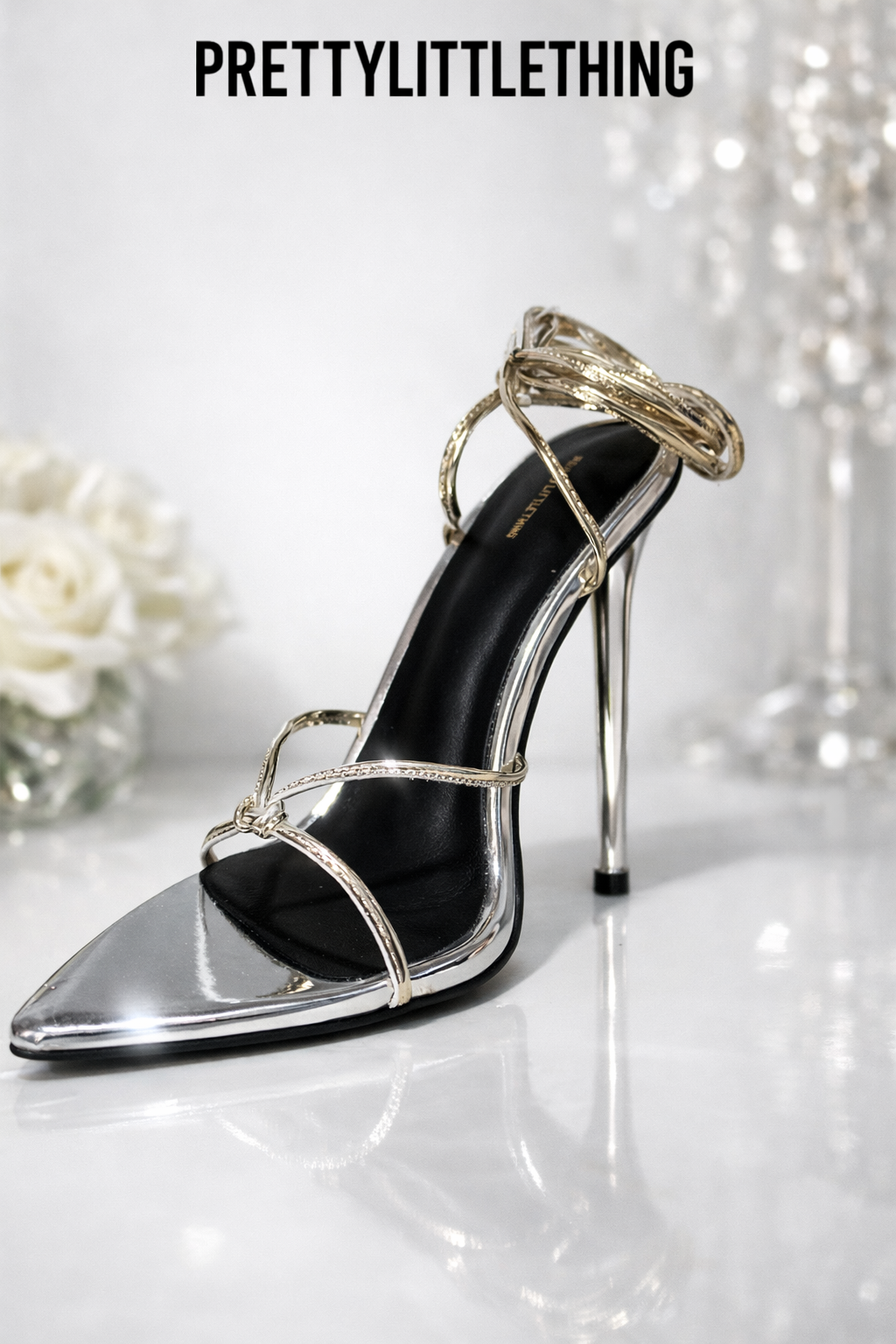خرید کفش مجلسی زنانه پریتی با طراحی متالیک نقرهای، پاشنه بلند استیلتو و بندهای ظریف. انتخابی شیک برای مهمانی و عروسی.