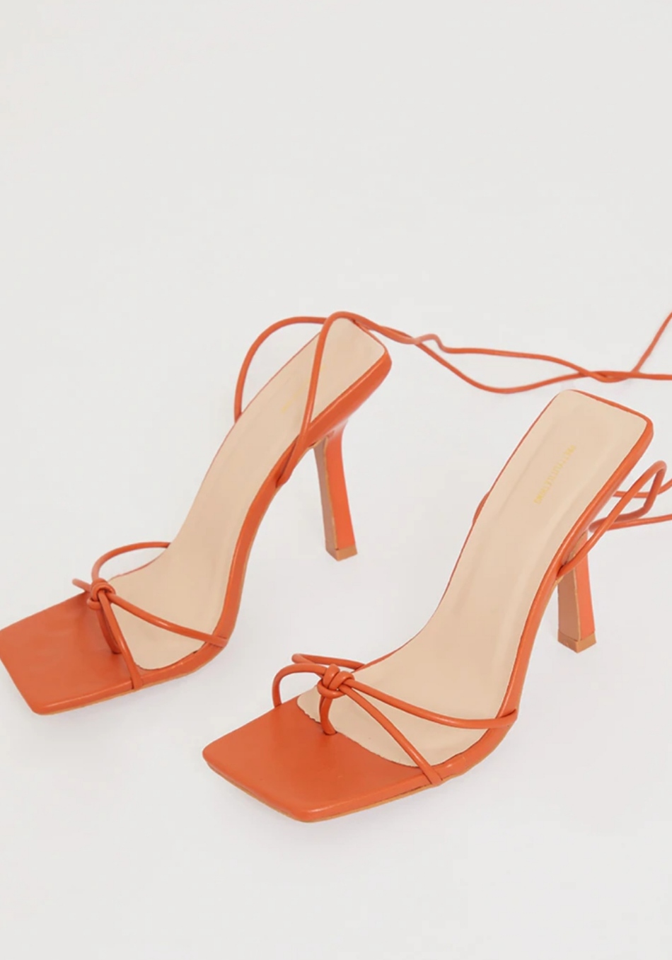 صندل زنانه بندی پاشنهدار نارنجی از برند PrettyLittleThing با طراحی مینیمال، پاشنه شیک و مناسب استایل مجلسی و روزمره. انتخابی خاص برای استایل تابستانی.