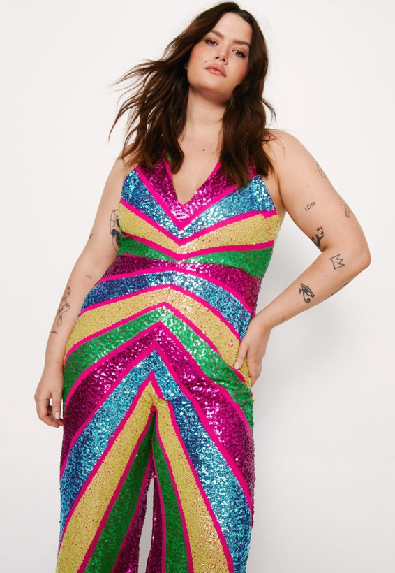 جامپسوت پولکدوزی زنانه با طراحی رنگارنگ و خطوط V-شکل. مناسب مهمانی، جشن و استایل شبانه. درخشندگی فوقالعاده و تنخور جذاب. خرید با بهترین کیفیت.