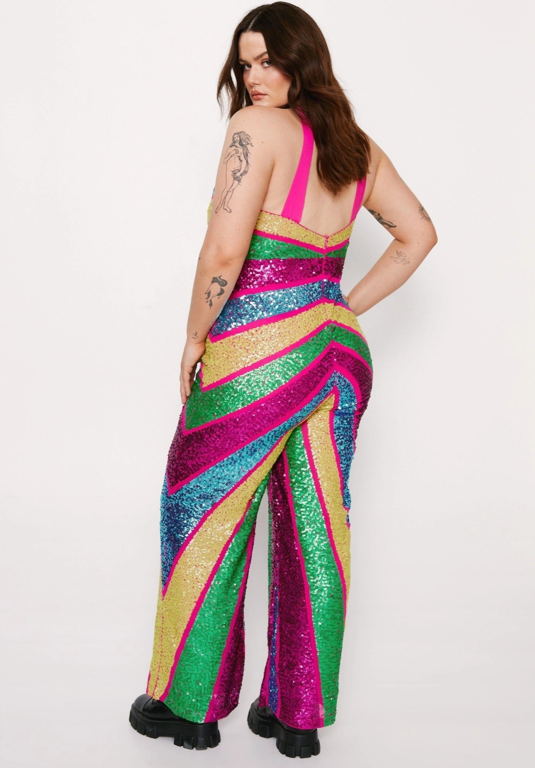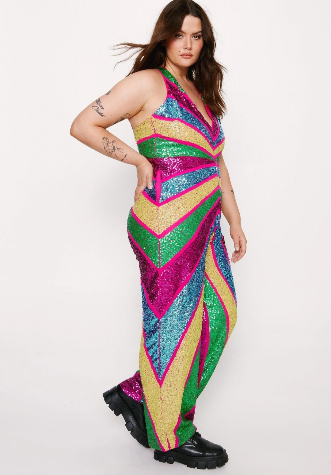 جامپسوت پولکدوزی زنانه با طراحی رنگارنگ و خطوط V-شکل. مناسب مهمانی، جشن و استایل شبانه. درخشندگی فوقالعاده و تنخور جذاب. خرید با بهترین کیفیت.
