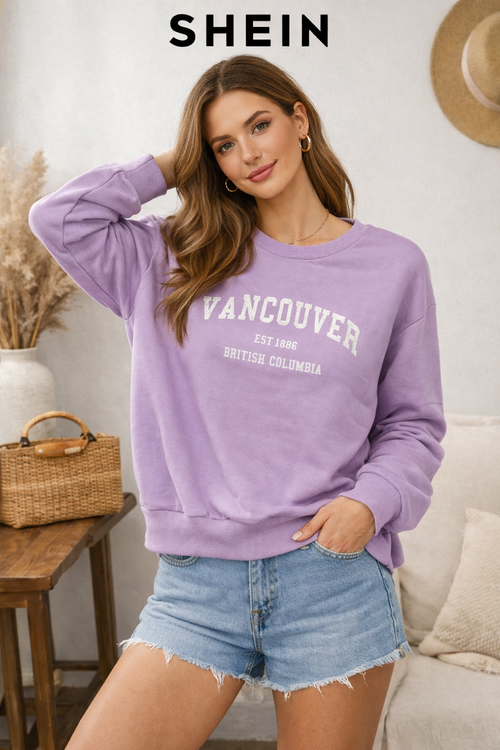 سویشرت زنانه SHEIN مدل Vancouver در رنگ یاسی ترند، انتخابی شیک و راحت برای استایل روزمره و اسپرت. این مدل با سایز XL، فیت آزاد و پارچه دورس باکیفیت، مناسب استفاده روزانه، پاییز و زمستان است.