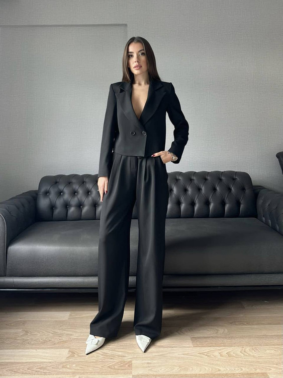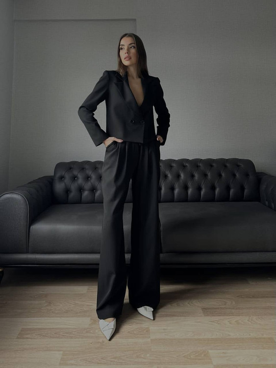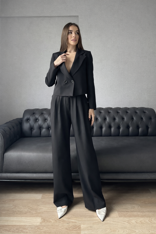 ست کت و شلوار زنانه مشکی مدل کراپ دو دکمه با شلوار بگ