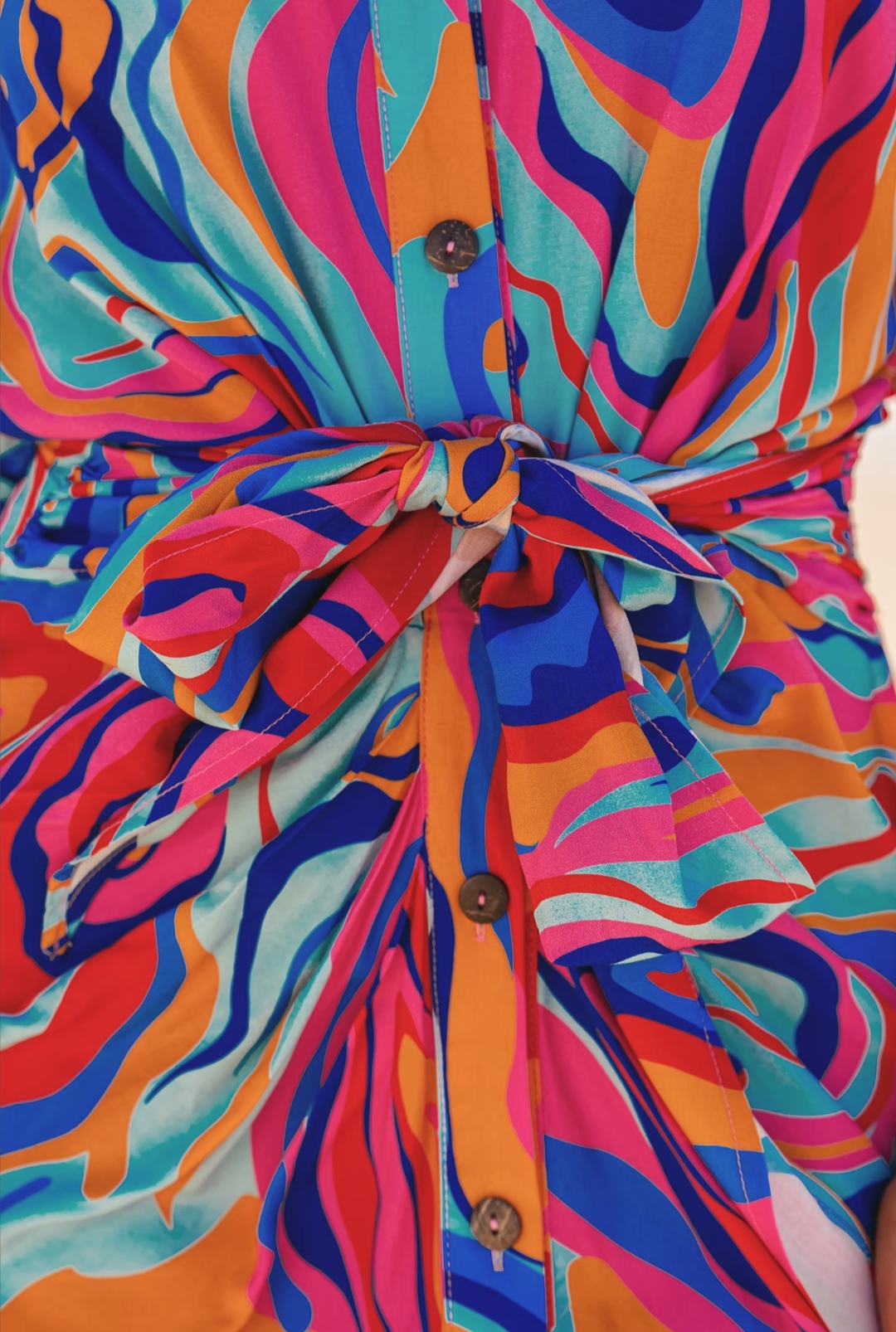 مدل دکمهدار جلو با کمربند پارچهای قابل تنظیم، باعث فرمدهی زیبا به اندام میشود. پارچه سبک و خنک آن حس راحتی فوقالعادهای در هوای گرم ایجاد میکند.