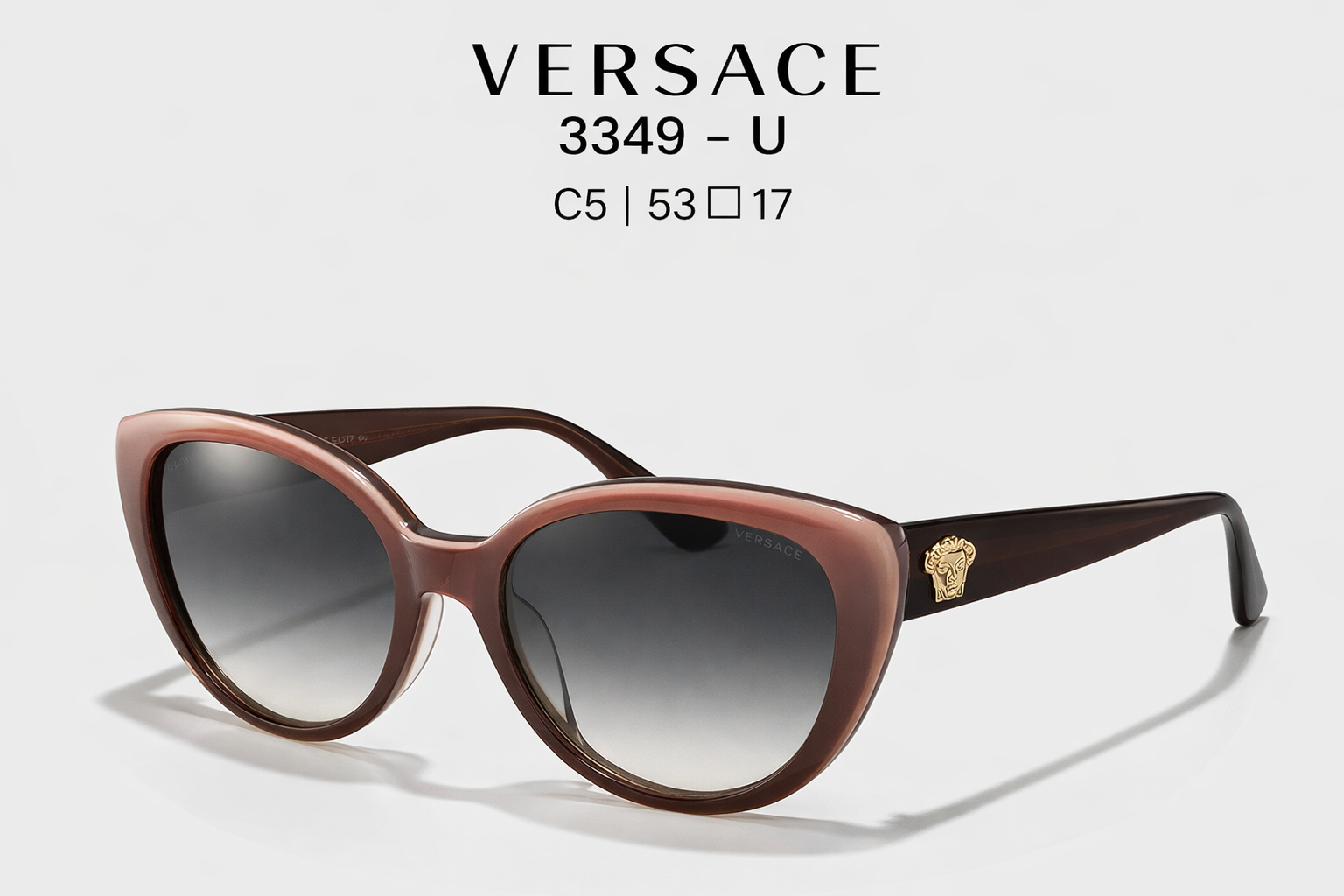 عینک آفتابی ورساچه مدل 3349-U C5 سایز 53-17 با طراحی گربهای، لنز دودی گرادینت و لوگوی طلایی مدوسا. ضمانت اصالت و ارسال سریع.