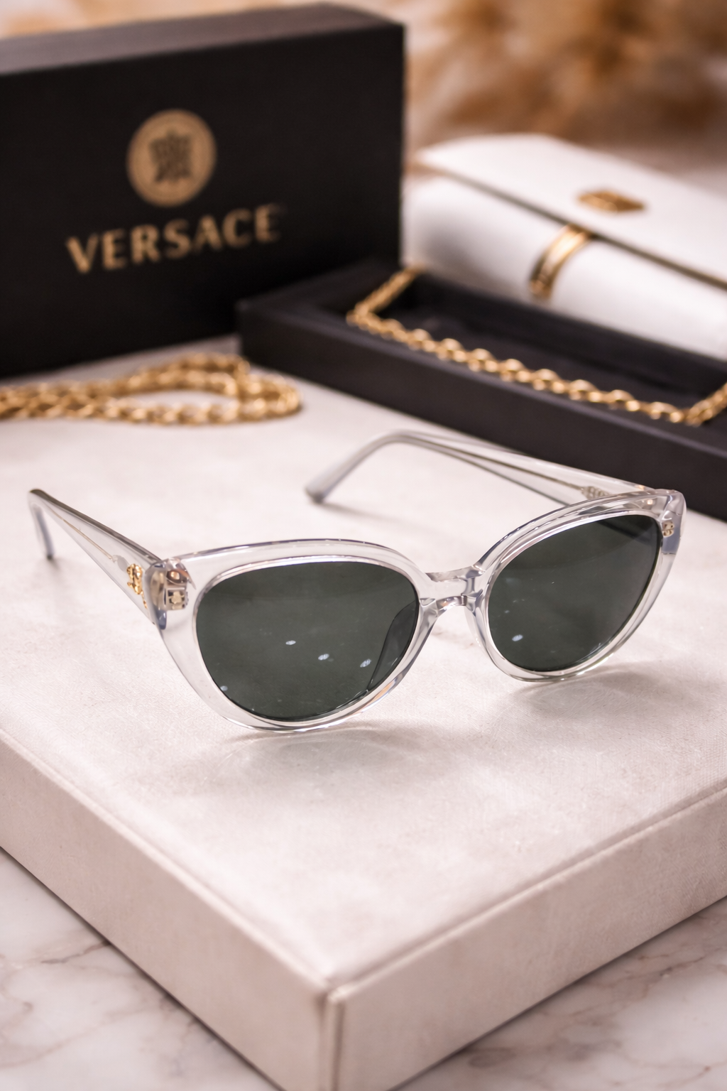 خرید عینک آفتابی ورساچه VE3349-U C4 سایز 53-17 اصل ایتالیا با بهترین قیمت. طراحی کتآی شفاف با لنز دودی UV400 مناسب بانوان شیکپوش. ارسال سریع و ضمانت اصالت کالا.