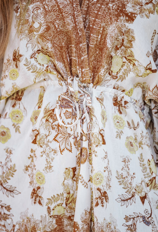 اگر به دنبال یک لباس ساحلی شیک و خنک برای تابستان هستید، این کاور ساحلی زنانه طرح بوهو بهترین انتخاب برای استایل خاص و متفاوت شماست. ترکیب رنگ کرم و قهوهای با نقشهای ظریف الهام گرفته از سبک بوهمی، جلوهای لوکس و جذاب ایجاد کرده که بهراحتی با مایو و صندل ساحلی ست میشود.