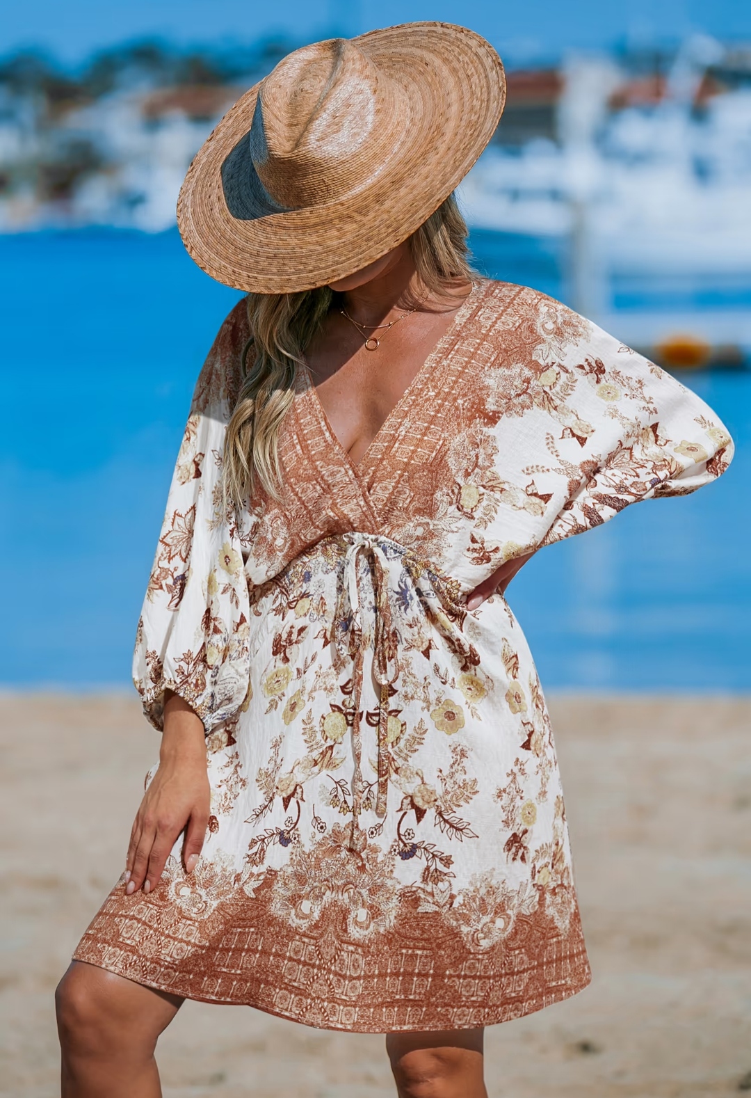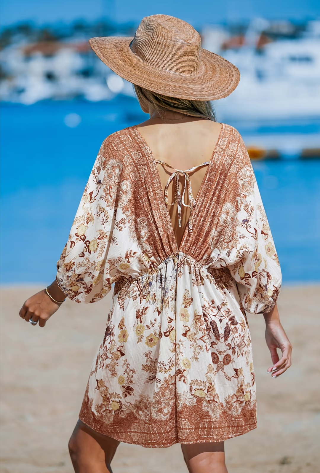 اگر به دنبال یک لباس ساحلی شیک و خنک برای تابستان هستید، این کاور ساحلی زنانه طرح بوهو بهترین انتخاب برای استایل خاص و متفاوت شماست. ترکیب رنگ کرم و قهوهای با نقشهای ظریف الهام گرفته از سبک بوهمی، جلوهای لوکس و جذاب ایجاد کرده که بهراحتی با مایو و صندل ساحلی ست میشود.