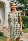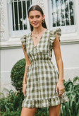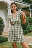 پیراهن مجلسی زنانه شیک و زیبا چهار خانه زیتونی یقه هفت بدون آستین
