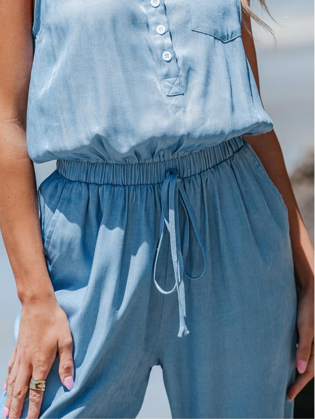 این سرهمی زنانه آبی روشن انتخابی عالی برای روزهای گرم سال است. پارچه سبک و تنفسپذیر آن باعث میشود حتی در طول روز هم احساس راحتی کنید. طراحی آزاد، کمر کشی قابل تنظیم و پارچه نرم، این مدل را به گزینهای ایدهآل برای استفاده روزمره، گردش، خرید، سفر و استایلهای کژوال تبدیل کرده است.
